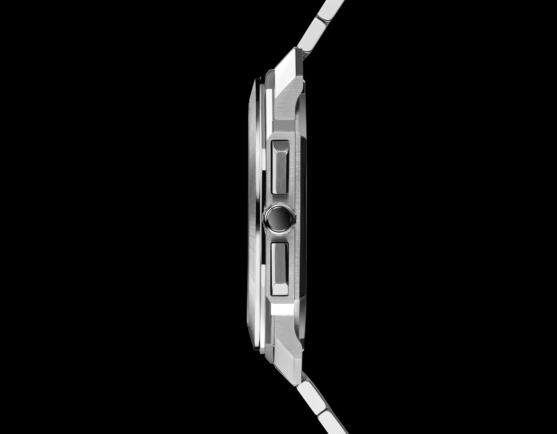 La cassa del Bulgari Octo Finissimo Chronograph GMT non ha bisogno di presentazioni: quel che si è già visto di buono sul Bulgari Octo Finissimo solotempo viene qui ripreso e adattato, con il minimo di modifiche necessarie, alla funzione cronografica. L’integrazione tra forma e funzione è tale per cui i pulsanti della cronografia risultano mimetizzati come spallette di protezione della corona. Lo spessore ridottissimo della cassa, meno di 9 mm, poi, fa sì che soltanto guardando il quadrante e notandovi i contatori tipici del cronografo si possa intuire che non si è di fronte a un orologio solotempo.
