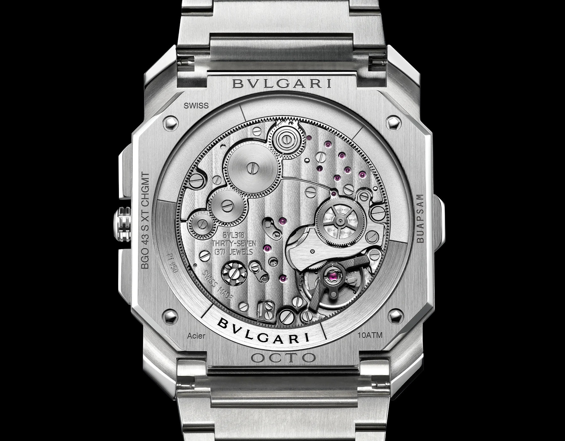 Non contenti però di aver creato un meccanismo cronografico di spessore eccezionalmente ridotto, in Bulgari hanno scelto di dotare il loro Octo Finissimo Chronograph GMT di una complicazione ulteriore, quella del GMT, visualizzata nel sottoquadrante a ore 3. Il bilanciere del Bulgari Octo Finissimo Chronograph GMT oscilla a 4 Hertz e la riserva di carica ammonta a ben cinquantacinque ore: perfetta per lasciare l’orologio in cassaforte durante il finesettimana e ritrovarlo marciante al rientro. Il calibro BVL 318, visibile grazie al fondello in vetro, si configura quindi come uno dei movimenti cronografici più avanzati sul mercato.