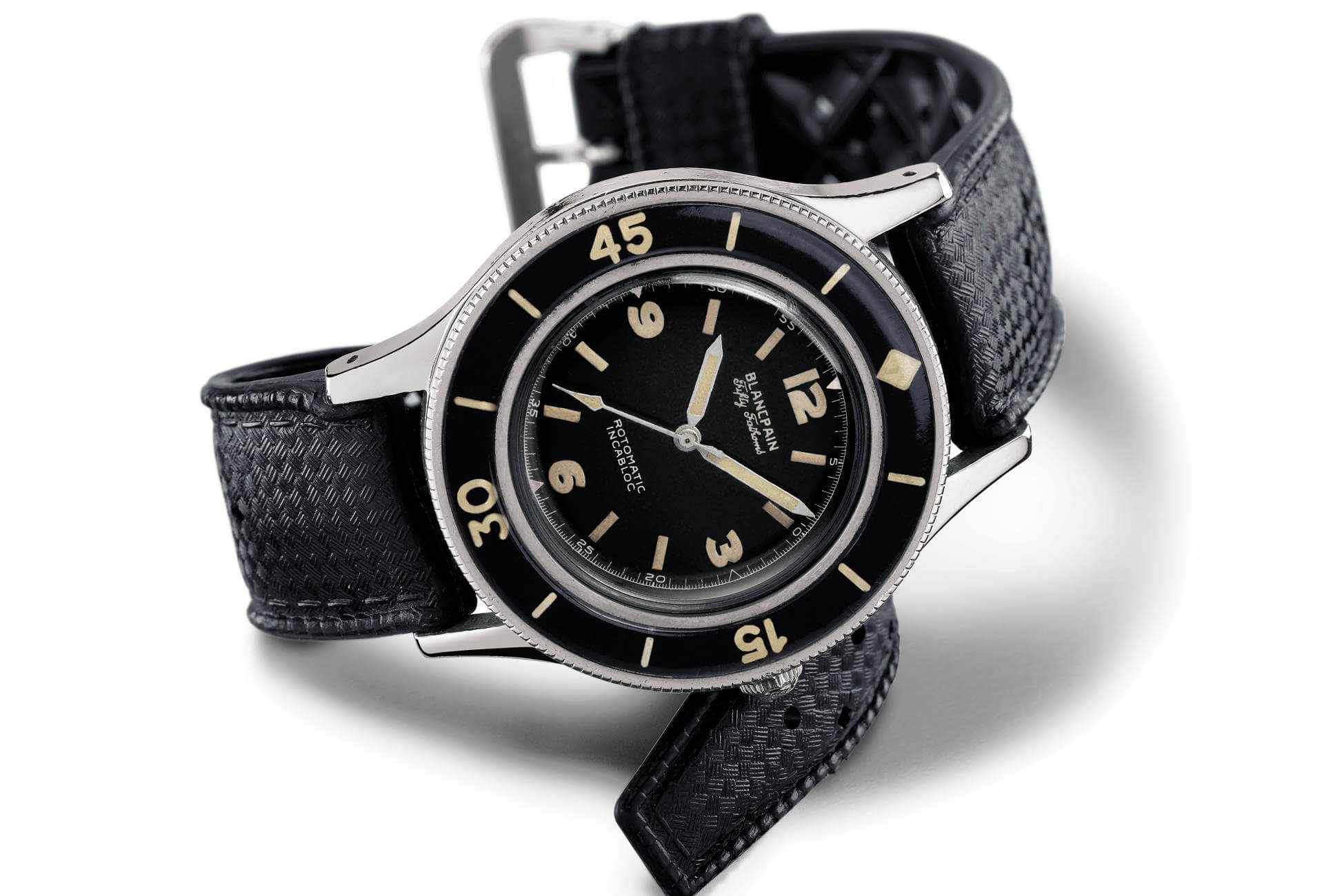 Il Blancpain Fifty Fathoms è stato il primo orologio subacqueo dedicato espressamente ai sommozzatori. L’ampio diametro della cassa, la ghiera girevole, la grande leggibilità, gli indici e le sfere luminescenti, il quadrante nero, sono tutte caratteristiche che oggi associamo all’orologio subacqueo e che sono state introdotte tutte assieme per la prima volta nel Fifty Fathoms del 1953.