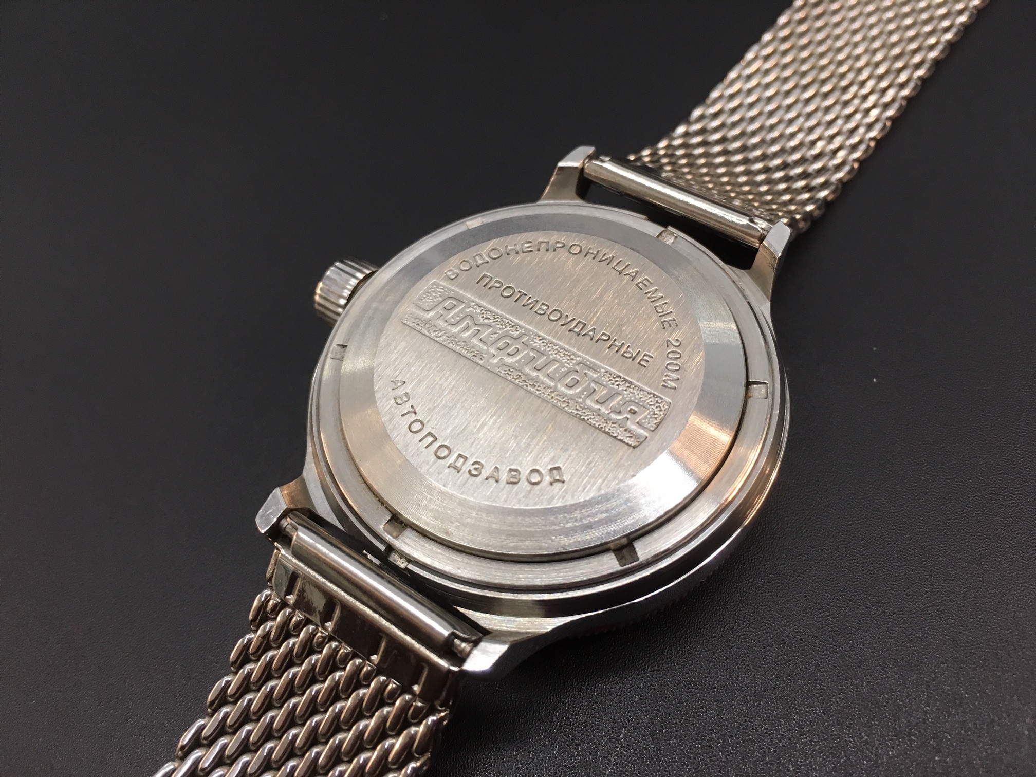 Le scritte in cirillico sul fondello -indubbiamente parte del fascino dei Vostok- indicano che siamo in presenza di un orologio la cui resistenza all’acqua è garantita fino a duecento metri, dotato di antishock, a carica automatica, e che il modello (scritta in rilievo su sfondo puntinato) è un “Amfibija”. A proposito, il nome è stato scelto per rappresentare la capacità di questo orologio di trovarsi ugualmente a proprio agio sulla terra e nell’acqua.