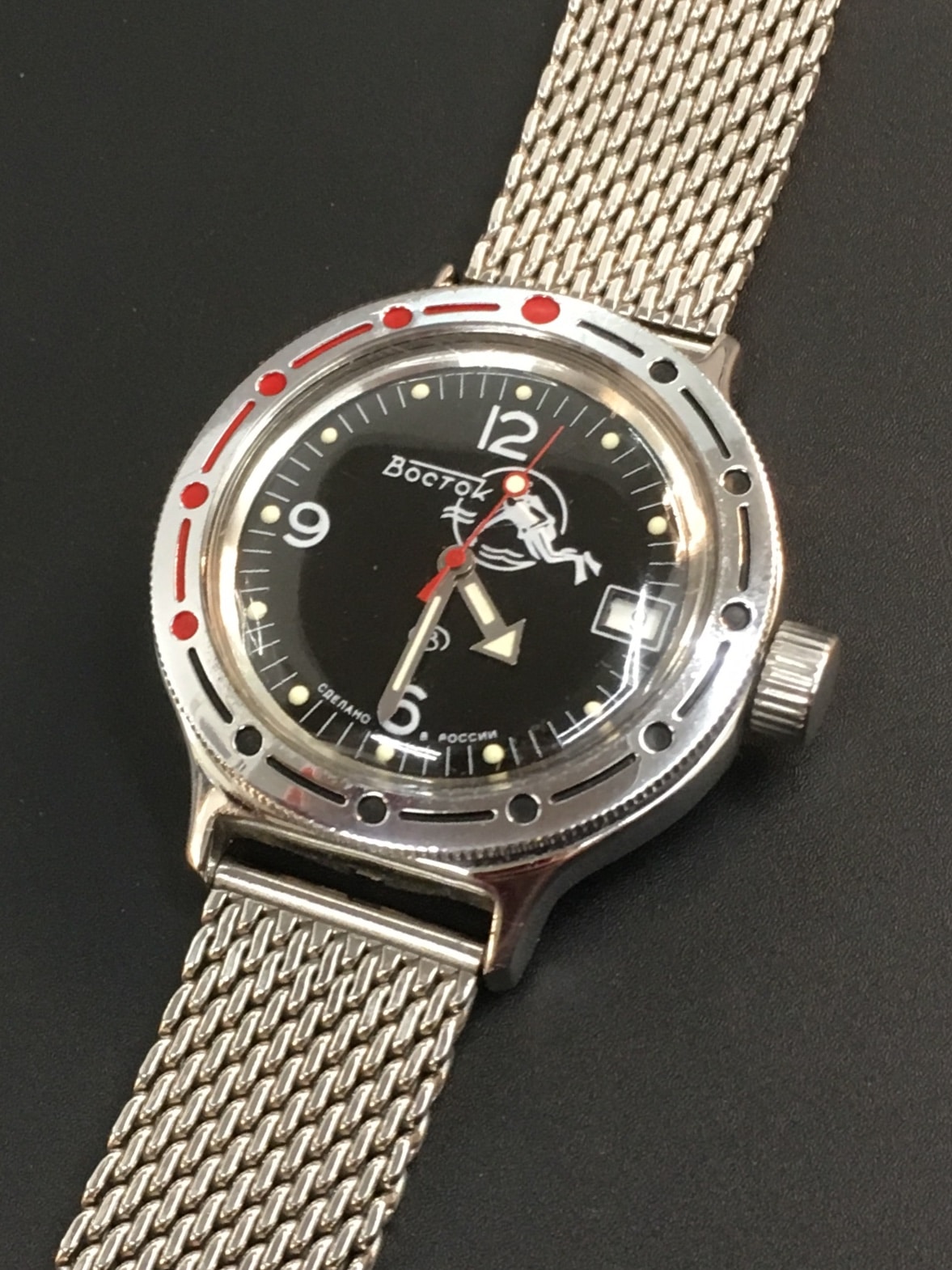In questa foto, il mio Vostok Amphibia Frogman su bracciale “chicchi di riso” di produzione Vostok