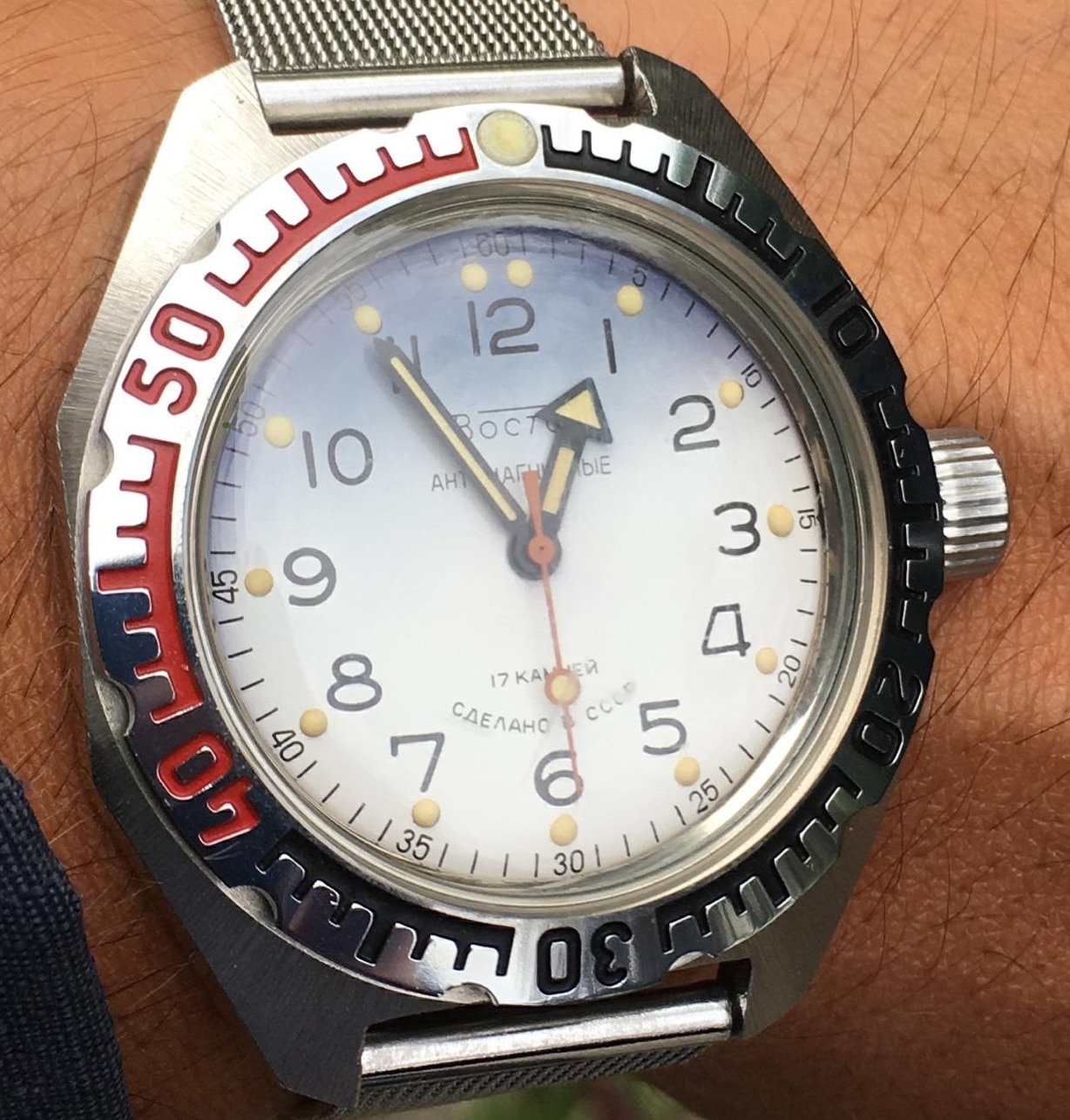 Con il tempo, il Vostok Amphibia viene aggiornato. Nascono nuove versioni con forme di cassa diverse, come la cassa ottagonale – detta dai collezionisti “Albatross” – visibile nell’immagine in apertura. In seguito viene introdotto un nuovo movimento a carica automatica. Gli Amphibia a carica manuale prodotti in epoca sovietica integrano inolte una controcassa in ferro dolce al loro interno, che li rende antimagnetici: verrà rimossa con il passaggio alla carica automatica per fare spazio al rotore di carica. L’esemplare con quadrante azzurro in apertura è proprio di questo tipo, come dimostra la scritta “antimagnetico” nella parte alta del quadrante. Posso testimoniare che la sua precisione è veramente notevole, entro i due secondi al giorno: detto per inciso, la magnetizzazione è uno dei maggiori disturbi che affliggono i movimenti meccanici oggi, a causa della presenza ormai ubiqua di dispositivi elettronici che espongono i segnatempo a campi elettromagnetici. La scelta dell’antimagnetismo, compiuta ai tempi dell’URSS per impedire all’orologio di far scattare le mine di profondità ad innesco magnetico, ha evidentemente un’inattesa influenza positiva sulla precisione di marcia oggi.